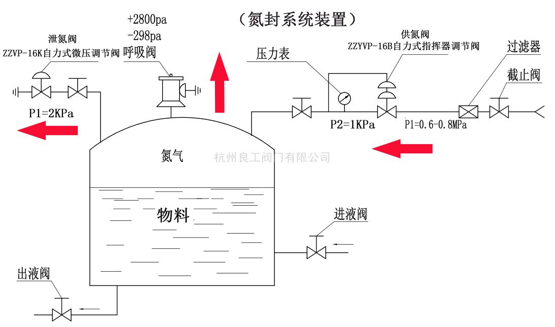 完整的氮封装置由供氮装置和泄氮装置两部分组成。供氮装置由指挥器和主阀两部分组成;泄氮装置由内反馈的压开型微压调节阀组成。氮气压力一般设为100mmH2O.通过氮封装置精确控制 。当储罐进液阀开启,向罐内添加物料时,液面上升,气相部分容积减小,压力升高,当罐内压力升高于泄氮装置压力设定值时,泄氮装置打开,向外界释放氮气,使罐内压力下降,降至泄氮装置压力设定点时,泄氮装置自动关闭。